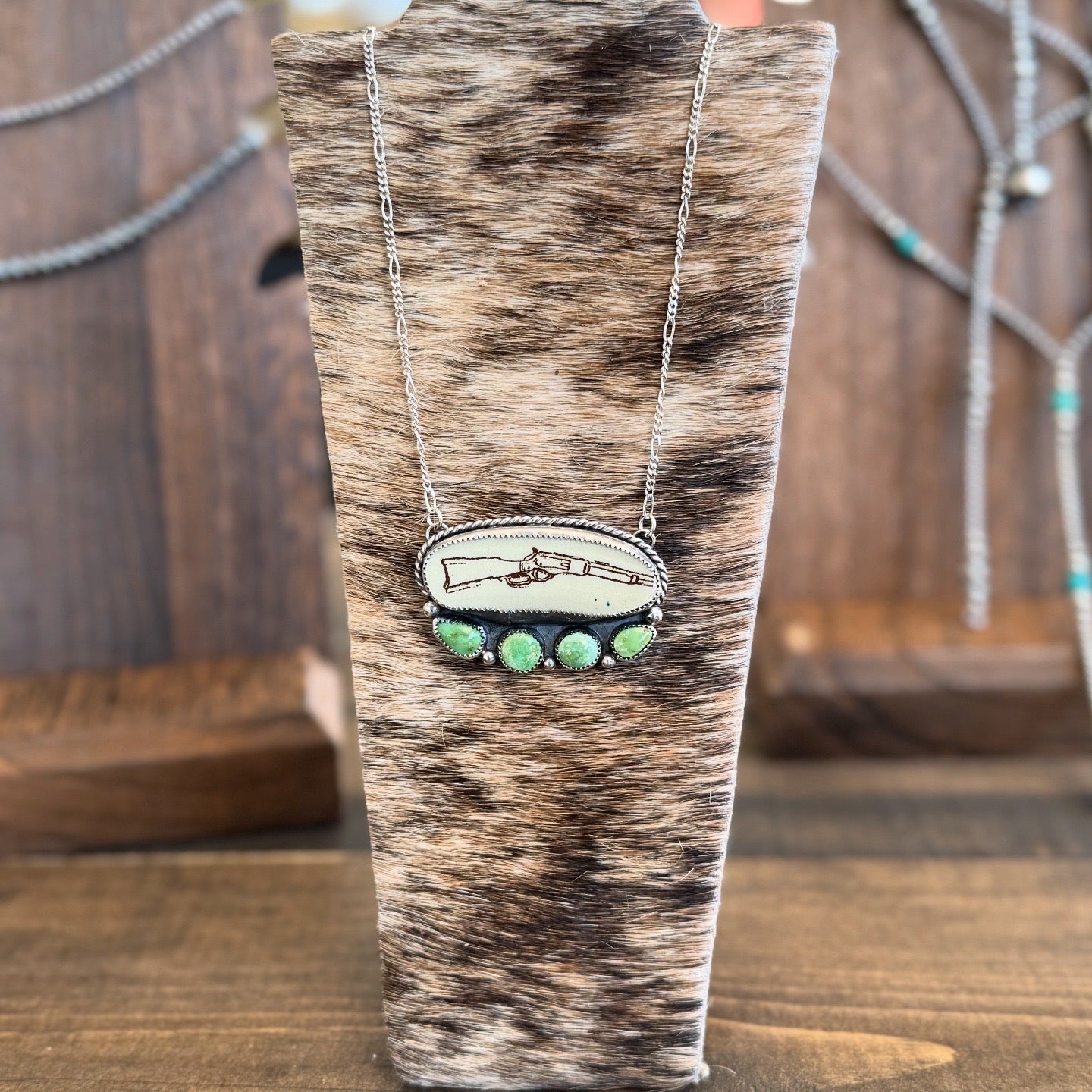 Ceramic plate set in sterling silver with Sonoran gold accents. Chain measures at 18” and is adjustable