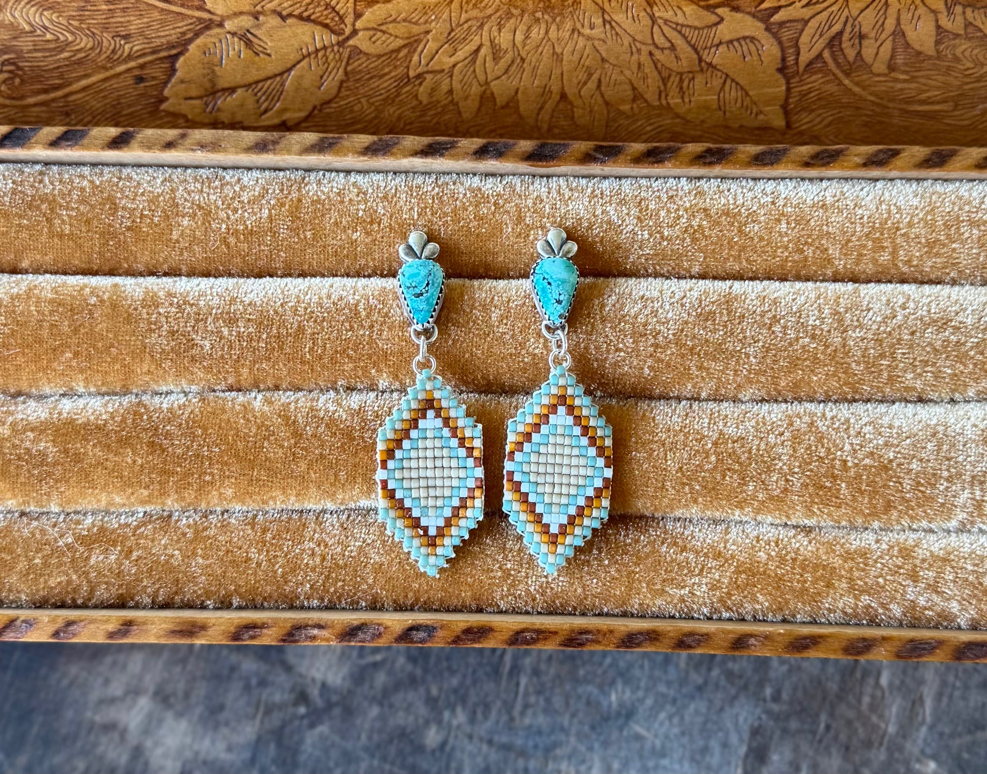 Kingman turquoise set in sterling silver with beading done by the amazing bears beads measures at 2.75”