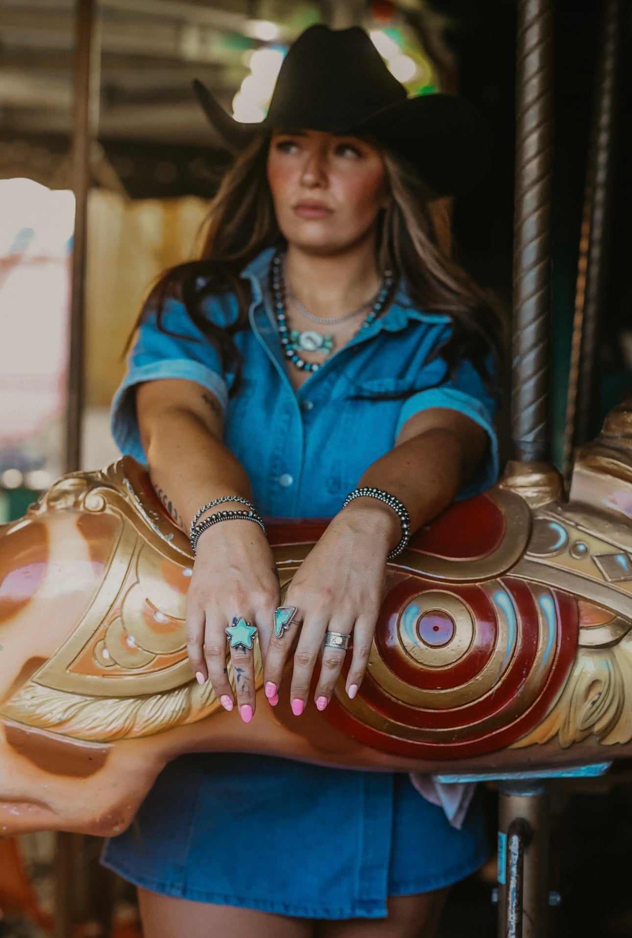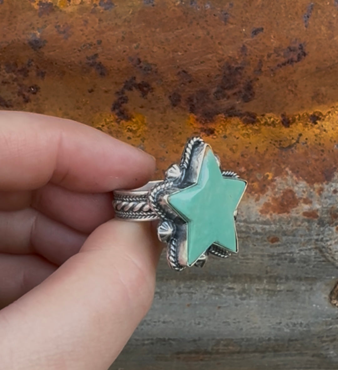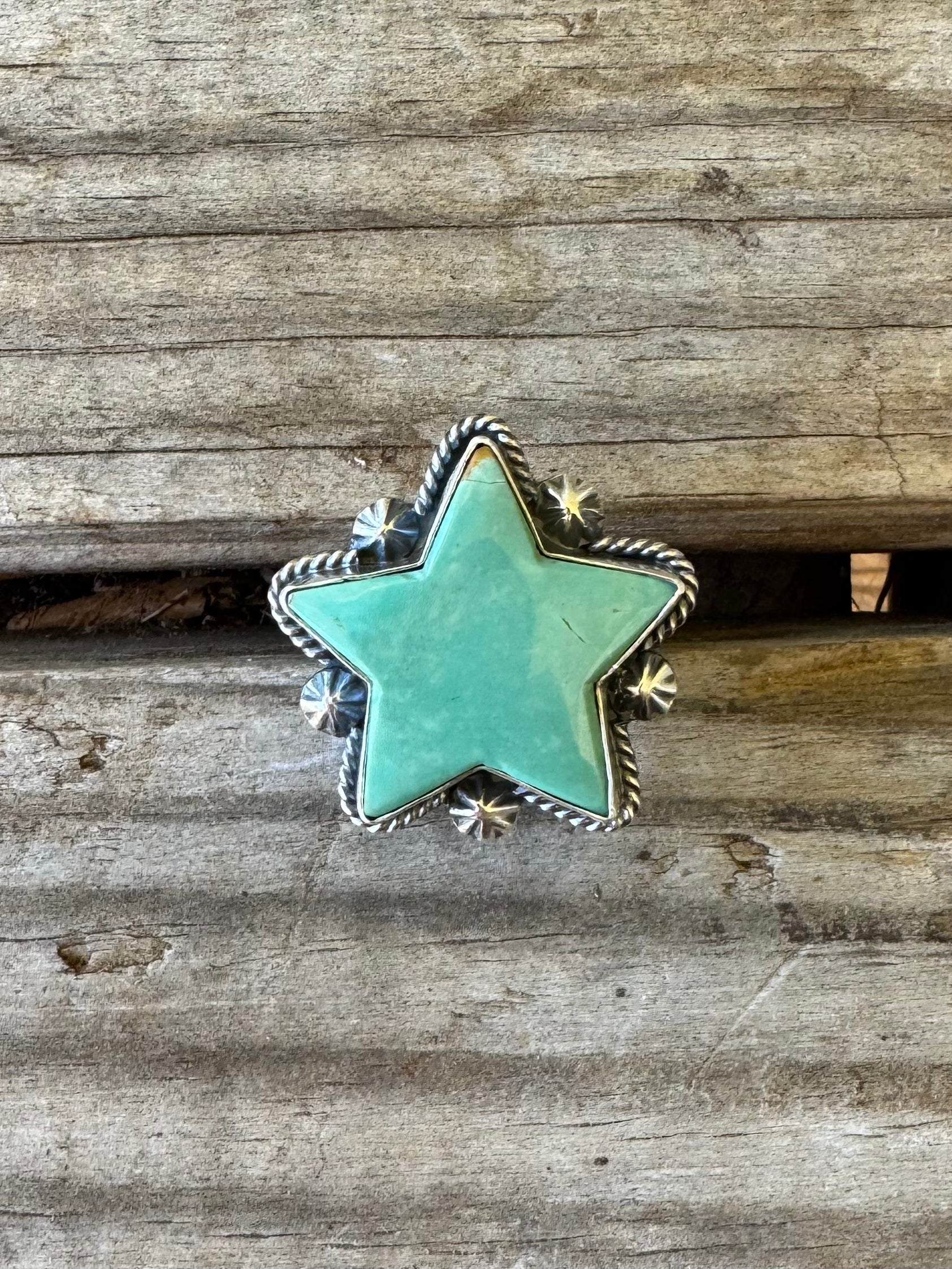 Royston set in sterling silver size 8 there is a hairline crack at one of the corners that has been stabilized by the stone cutters. It won’t give you trouble but it is there