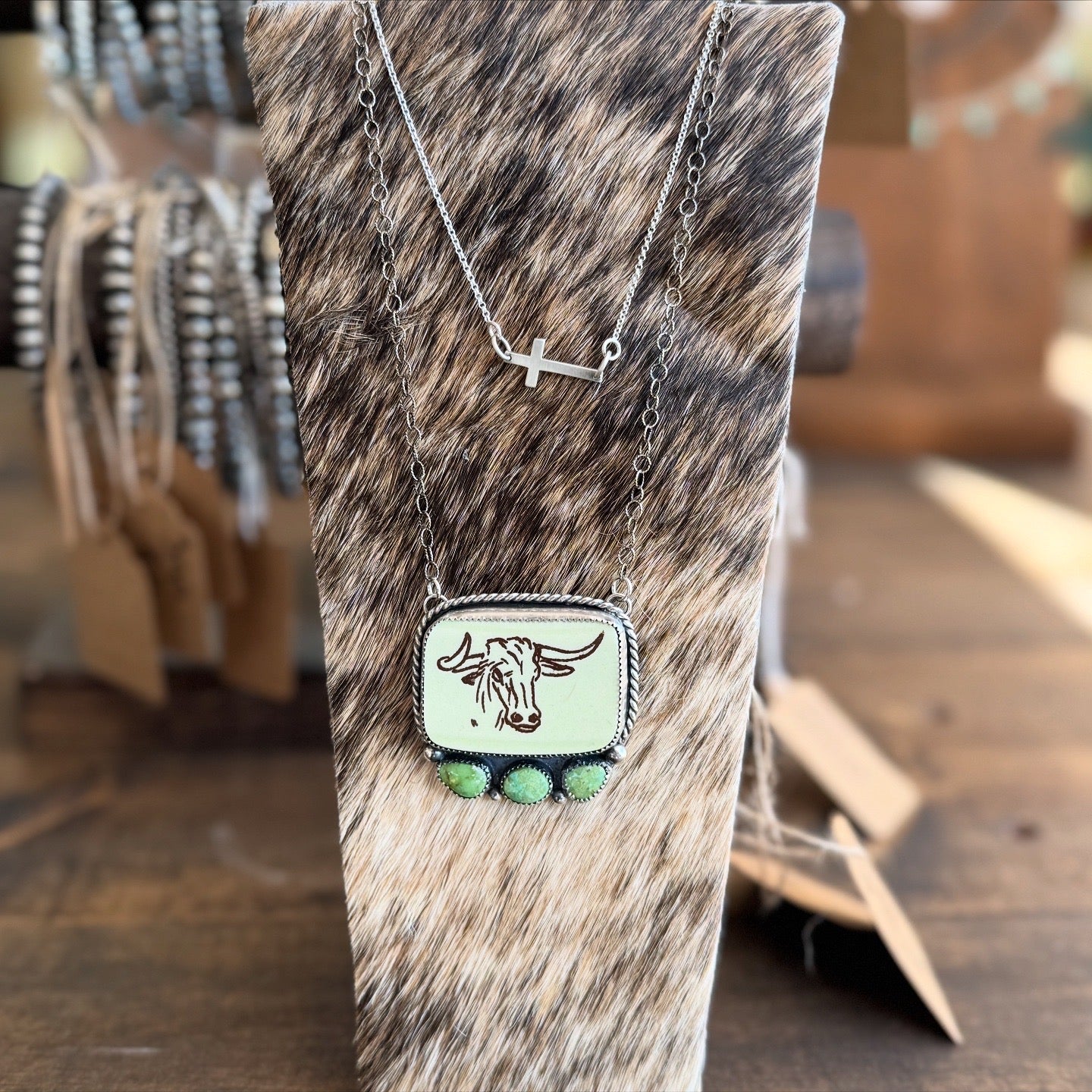 Ceramic plate set in sterling silver with Sonoran gold accents. Necklace is adjustable and measures at 19.5”