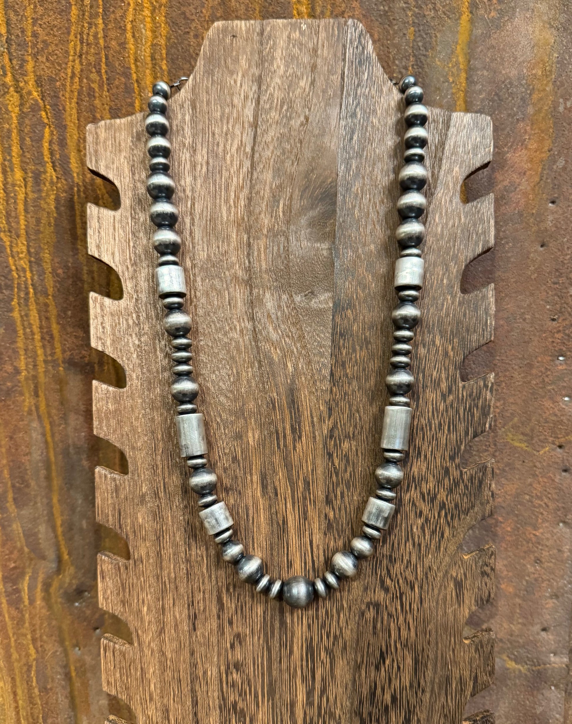 7-16mm pearls, round, saucer and cylindrical. 20” long with 3” extender